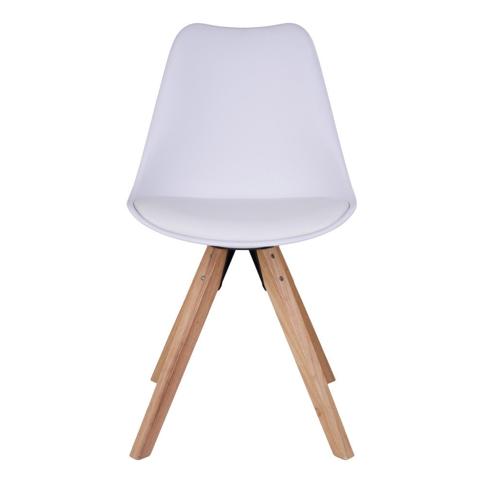 Deze stoel combineert een comfortabele zitting van PU-leer met de warmte van natuurlijke houten poten. De helderwitte zitting en het natuurlijke hout zorgen voor een frisse, strakke uitstraling, waardoor hij geschikt is voor verschillende eetkamerstijlen en een vleugje Scandinavisch geïnspireerde eenvoud toevoegt.