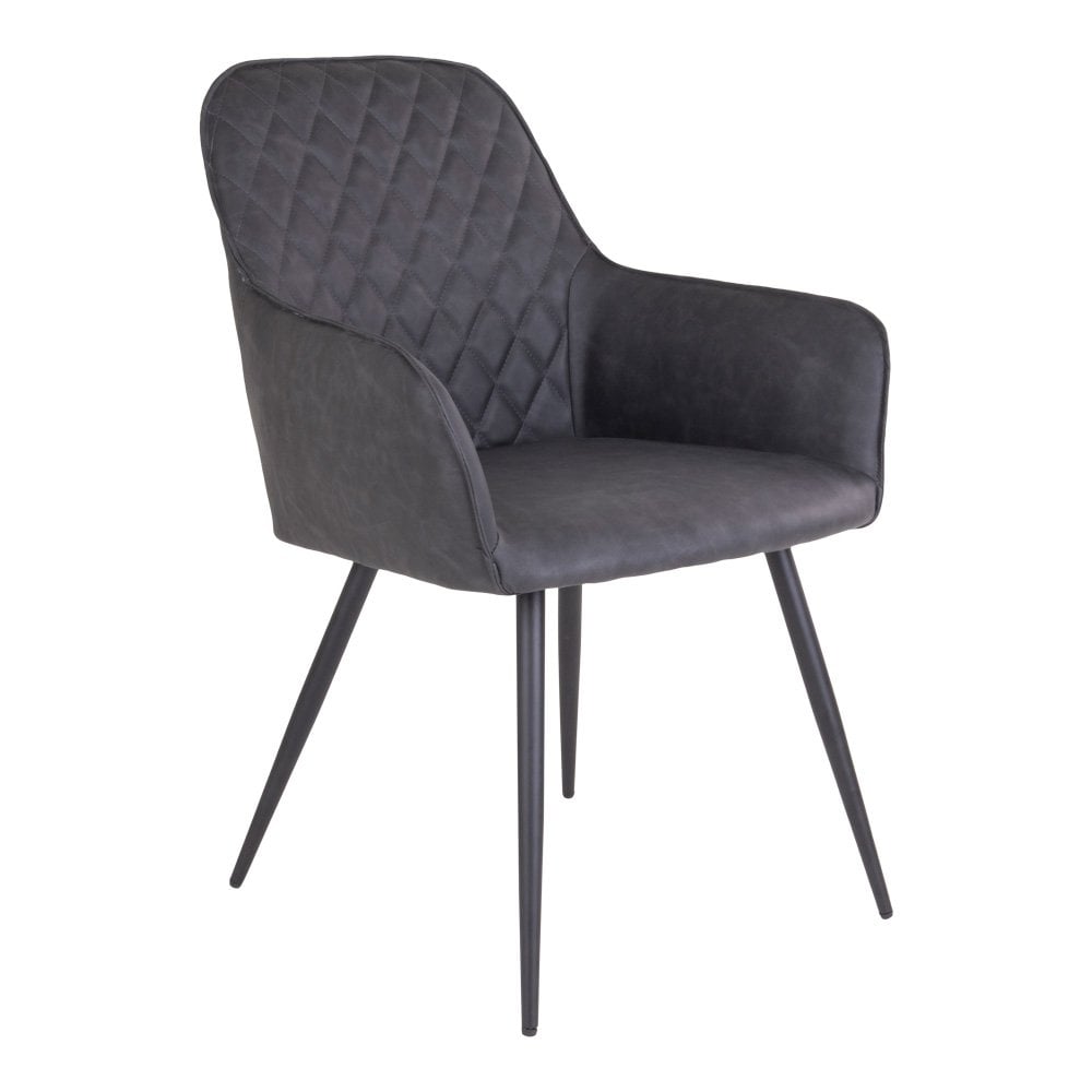 De Harbo Dining Chair heeft een PU-leren zitting in een donkergrijze kleur en zwart metalen poten. Deze stoel biedt comfortabele zitplaatsen en een stijlvolle, veelzijdige uitstraling, geschikt voor diverse eetruimtes. Deze stoel wordt geleverd in een set van 2.