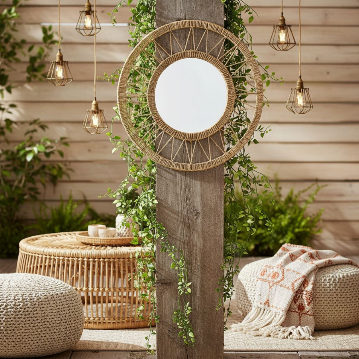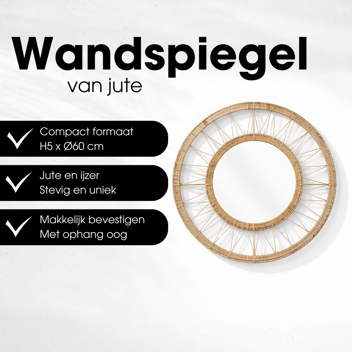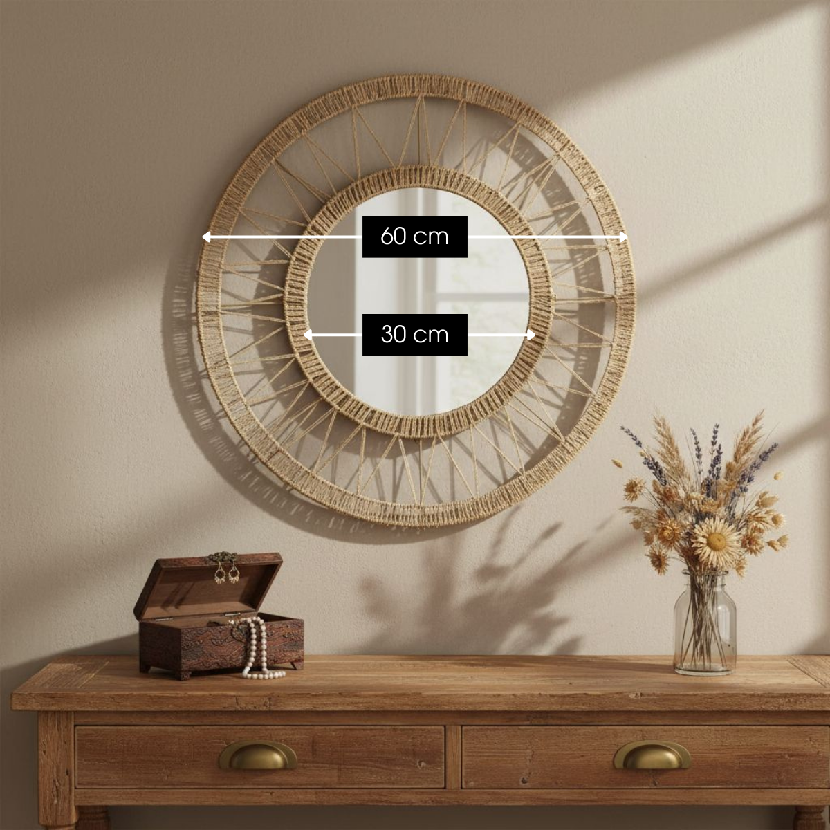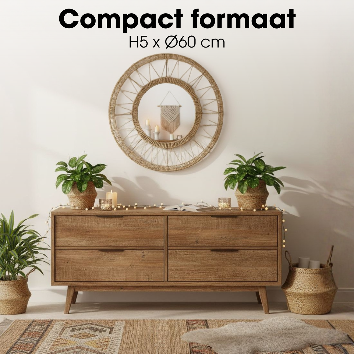 Geef je interieur een bohemian touch met de Ludy wandspiegel van Mica Decorations. Deze ronde spiegel is voorzien van een opvallende jute rand in lichtbruine tint, wat het ontwerp een natuurlijke en decoratieve uitstraling geeft. Of je hem nu ophangt in de hal, woonkamer of slaapkamer: de spiegel zorgt direct voor extra sfeer aan de muur. Door het lichte frame past de spiegel goed in verschillende interieurstijlen. Combineer hem met andere ronde spiegels voor een speels effect of laat hem als solostuk stralen.